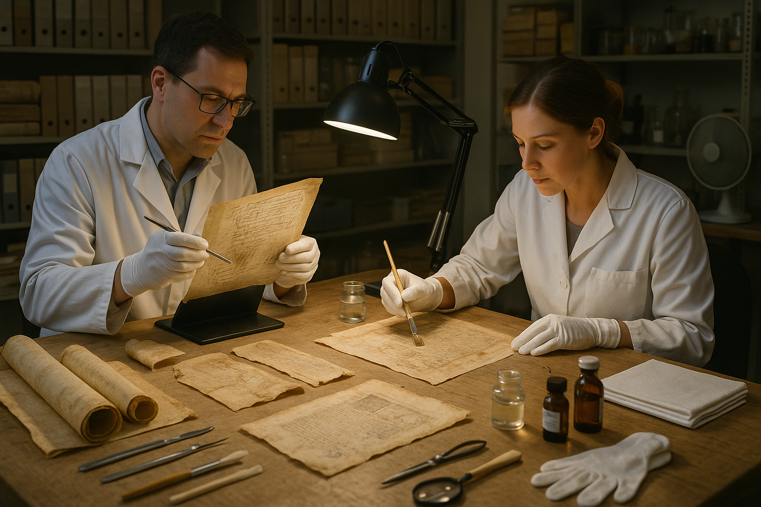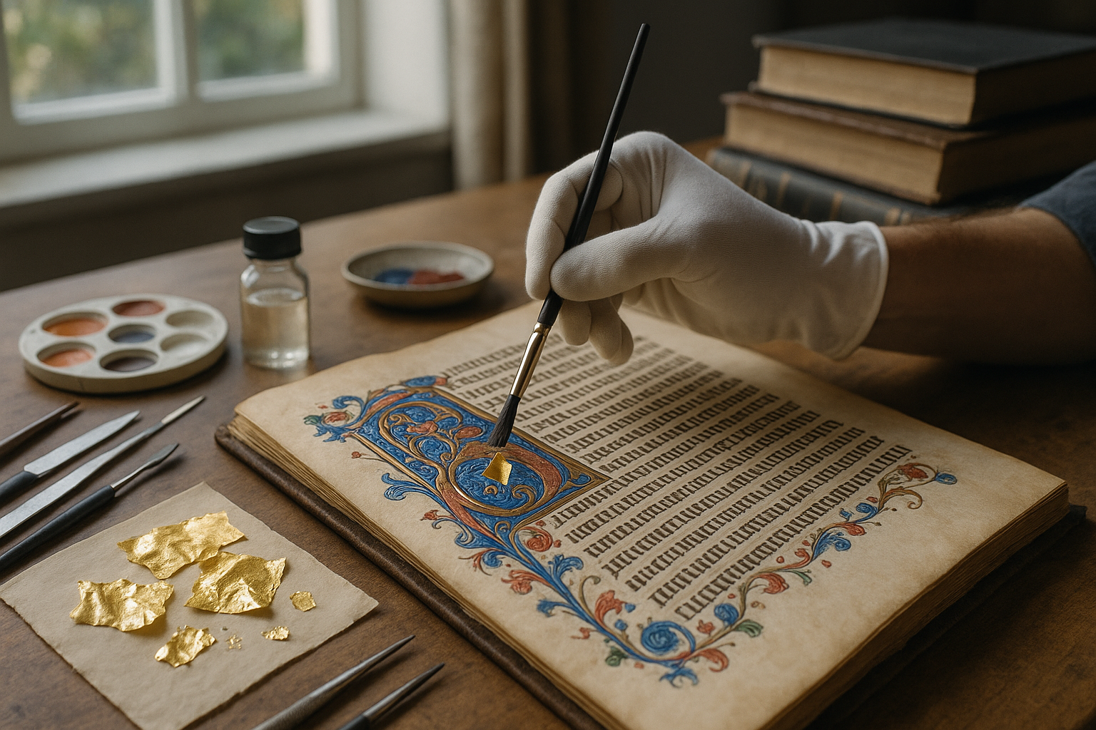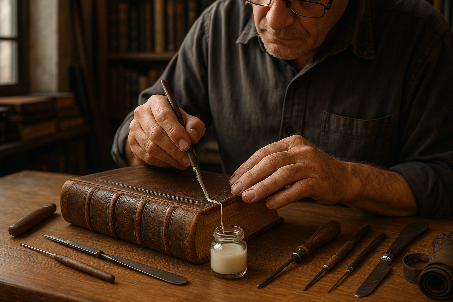 In a dimly lit room, surrounded by the scent of aged paper and leather, a restorer delicately turns the fragile pages
